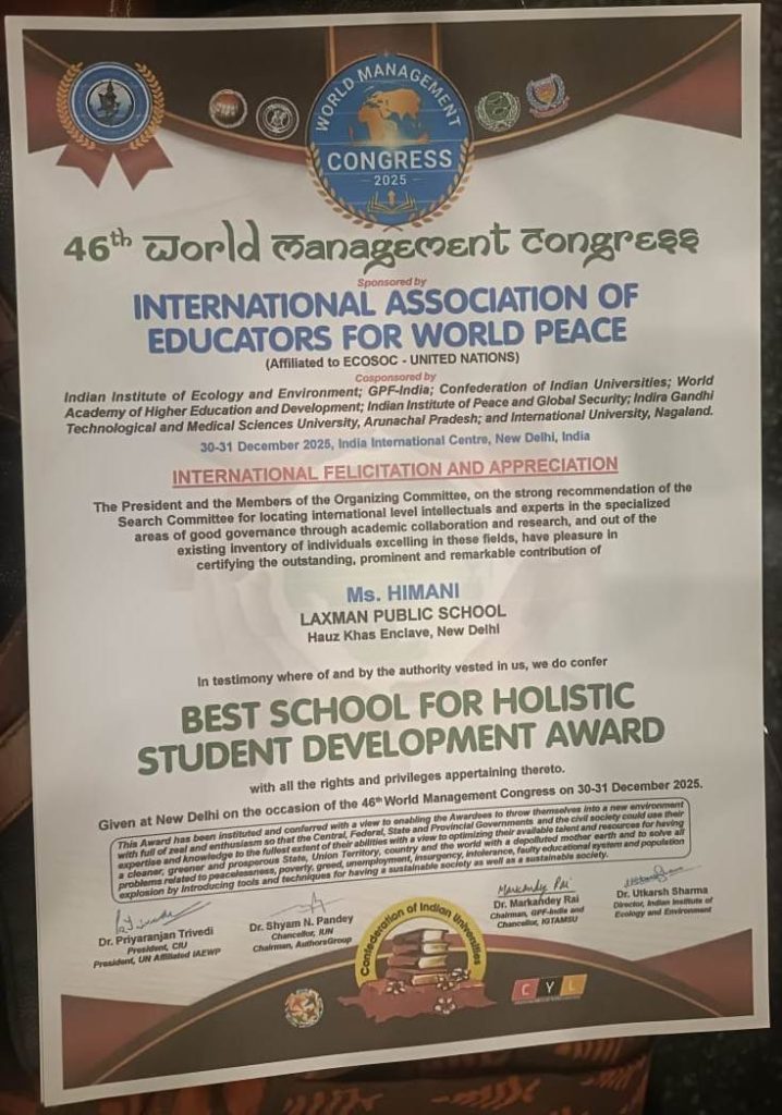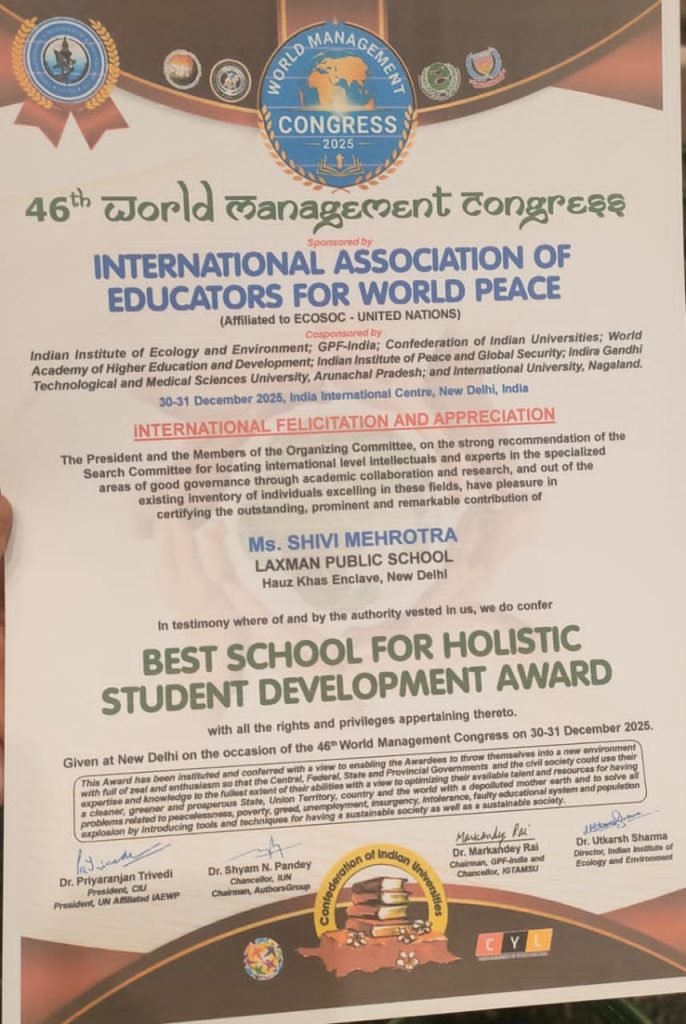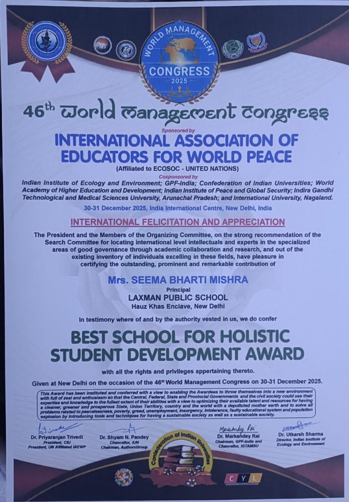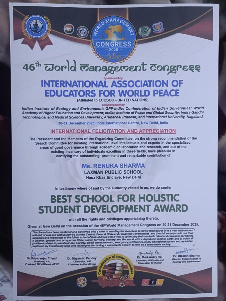 Laxman Public School, Hauz Khas is proud to announce that the school has been conferred the Best School for Holistic Student Development Award at the 46th World Management Congress 2025, held at the India International Centre, New Delhi.